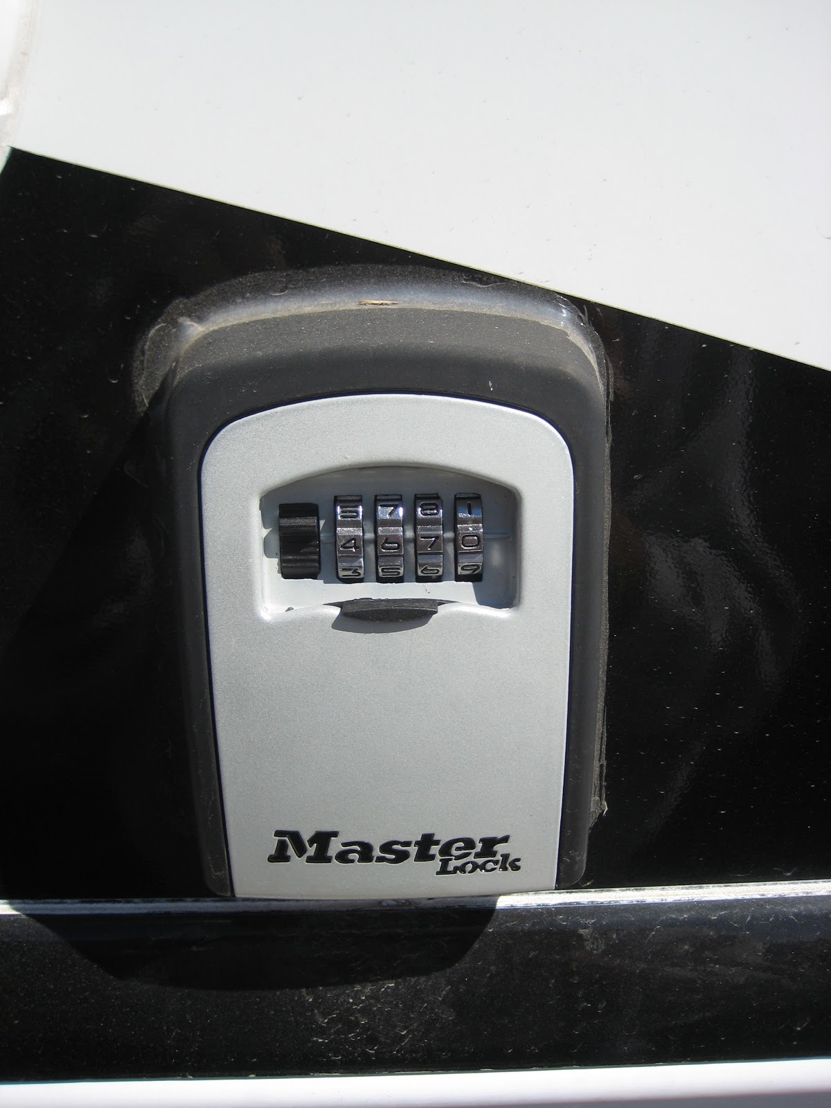 Lock Box - Installed a lockbox on the outside so that when I was traveling, or in an emergency, anyone with the code could enter the box, grab keys, and access the bus. It's mounted near the heater vent and near the outside speaker. It's weatherproof, available at most home stores. Cost was about $30.